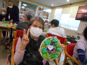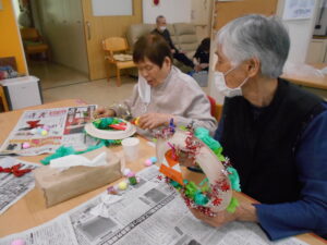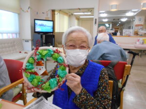 制作レクでは自宅で使用して頂けるよう、クリスマスリースを作成しました。