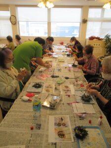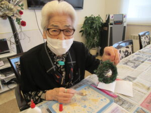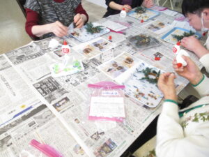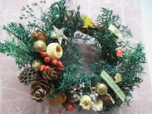 つるで編まれた直径10㎝ほどの輪に ヒムロ杉、木の実やオーナメントなど