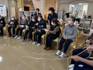 毎年恒例のこちらのレクは、新年の運試しとして紐を全員で引っ張り、5円玉が
