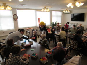 豆の代わりにソフトビニルボールを投げ、みなさんで鬼を退治してもらいます。