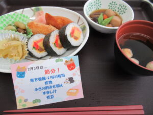 昼食はお稲荷さんと恵方巻風の巻きずしです。