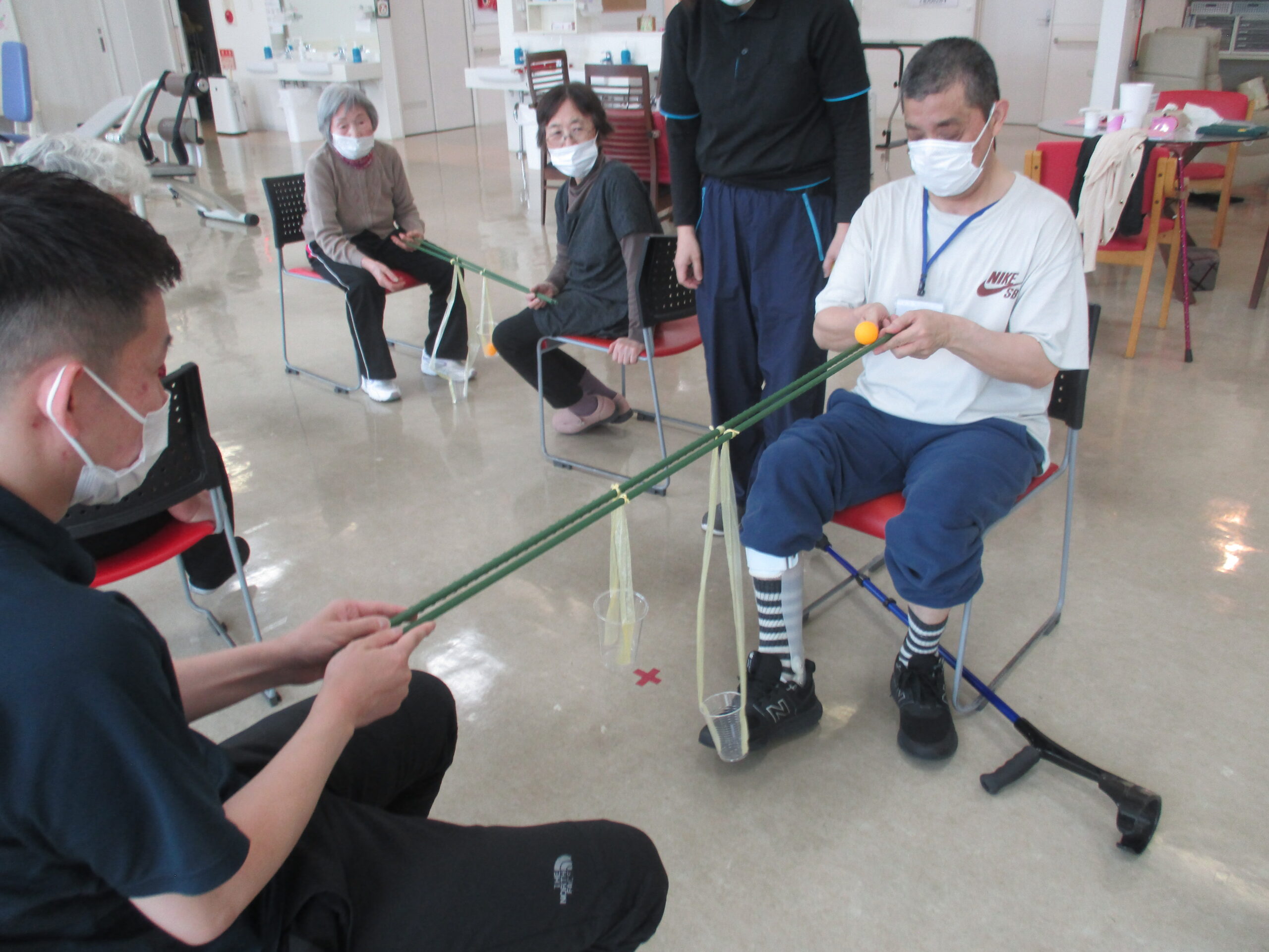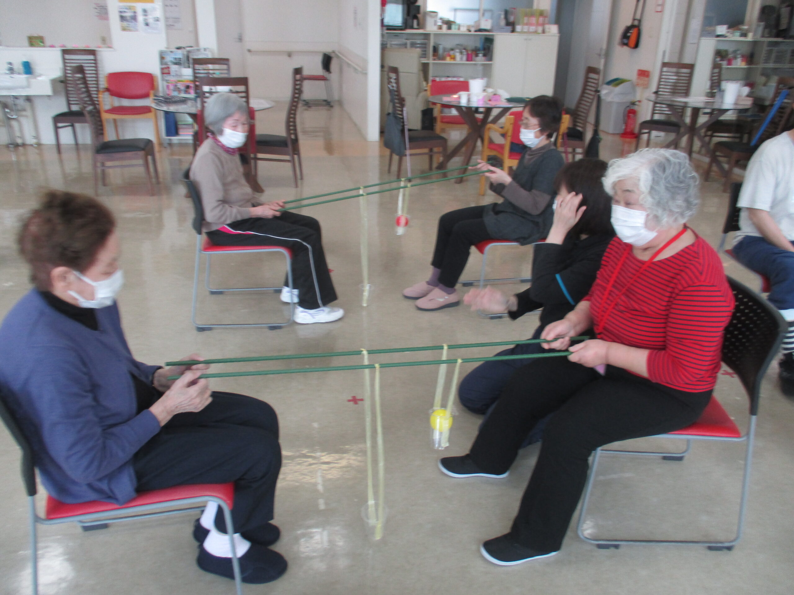 向かい合わせになり、2人で協力しながら先にあるカゴに入れる体操になります!